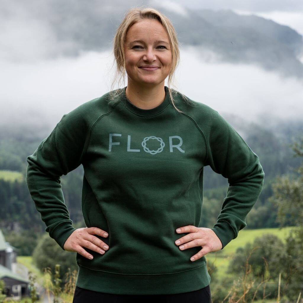 Genseren har Flor-logo på brystet og lomme med Flor-O i nedre kant på venstre side.