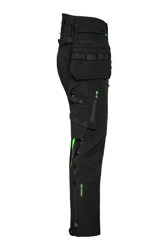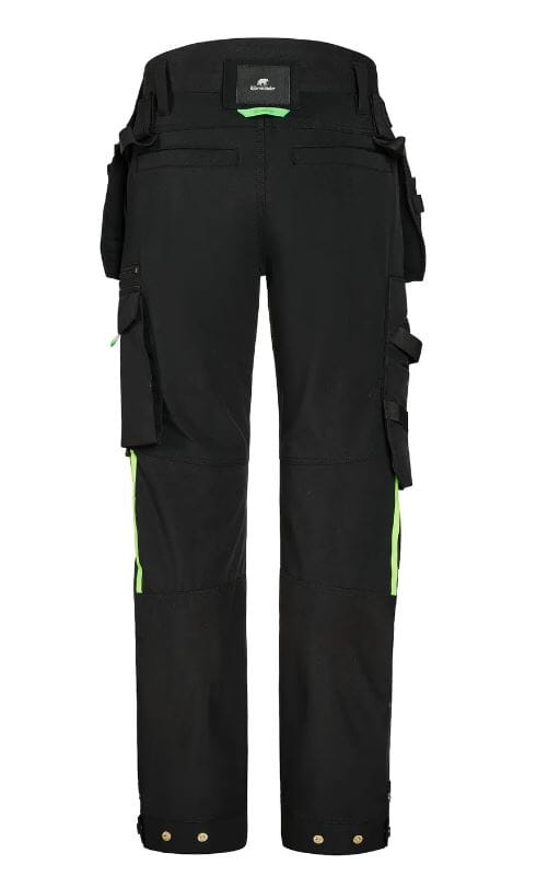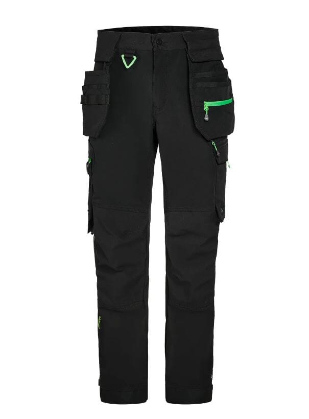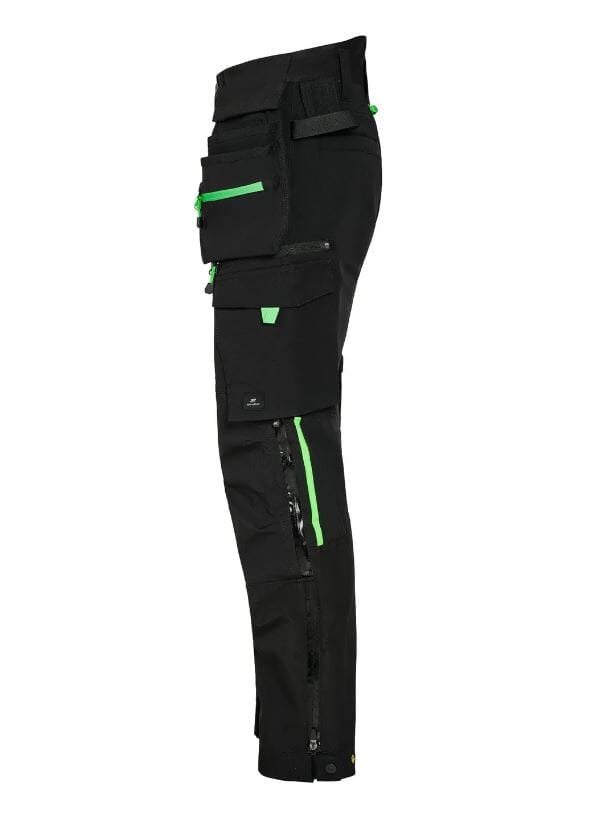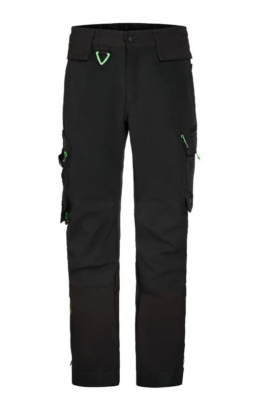 Hybrid håndverksbukse i nøye utvalgte materialer. Hovedmaterialet er et fullstretch-materiale i resirkulert polyamid. Ved benavslutning brukes vannavvisende softshell samt vanntett glidelås for økt beskyttelse mot fukt. Benvidden kan justeres med stropp og knapp. Knebeskytterlommen med forsterkningsmateriale åpnes fra utsiden med glidelås – som også gir mulighet for ventilasjon. Hengelommene er avtagbare, og buksen har forhøyet rygg for ekstra komfort.