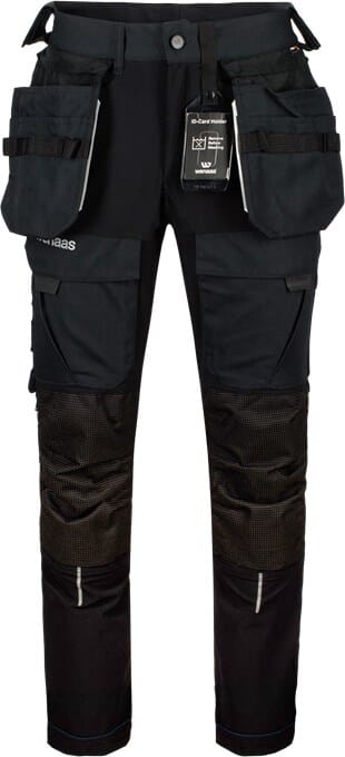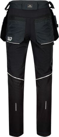Slitesterk arbeidsbukse i stretch med beltestropper i linning, knappelukking- og glidelås i gylf. Forhøyet linning midt bak beskytter korsryggen. Bærestykke, kile i skrittet. Buksen har de fleste praktiske lomme og verktøyløsninger du kan tenke deg. Glidelås på siden av beina for ventilasjon, justerbar bredde og benlengde. Forsterkede kneputelommer med to nivåmuligheter gjør at kneputen passer deg uansett om du har korte eller lange ben. Du velger rett nivå kneputen skal sitte på. Refleksstriper gir ekstra synlighet i mørket. Egner seg for alle som trenger en håndverksbukse med mengder av lommer og muligheter for montering av verktøy.