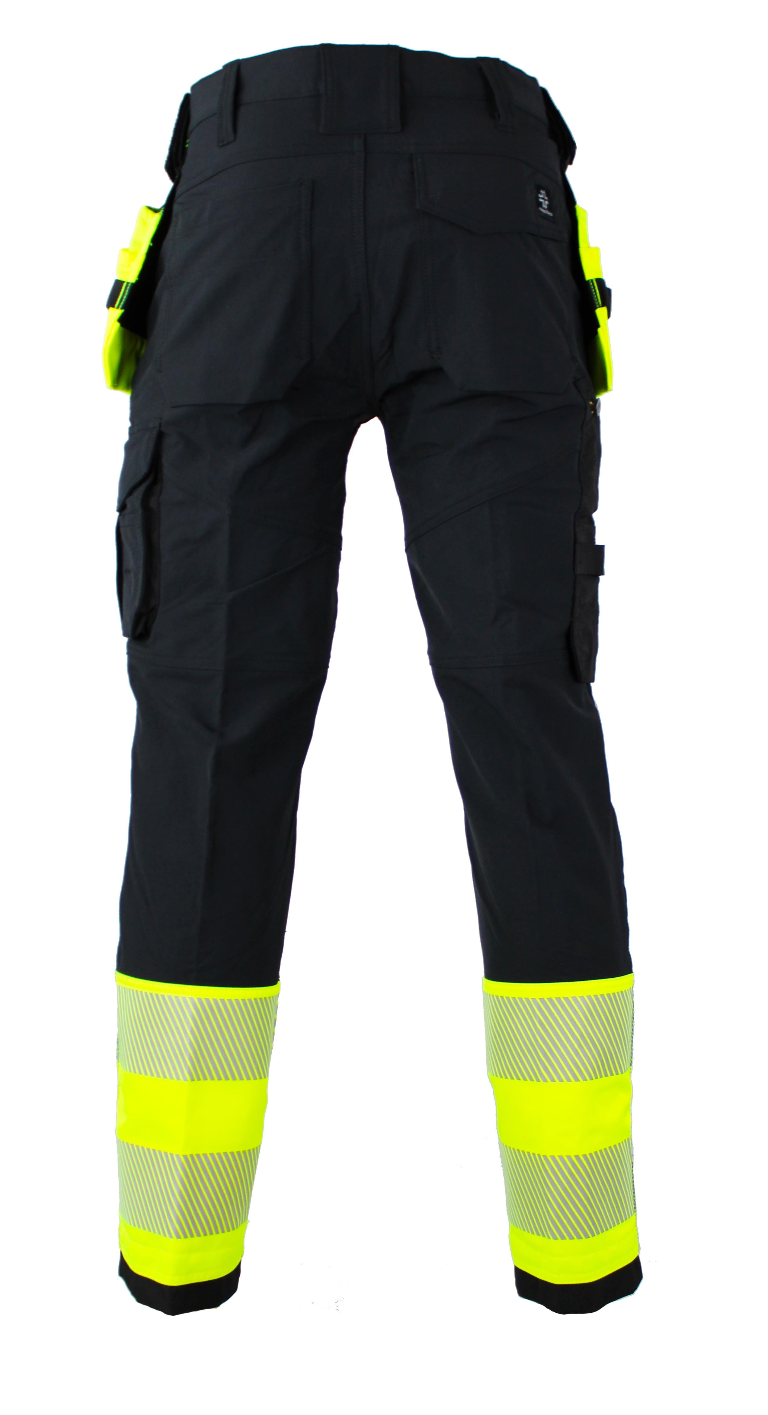 Stretchbukse med 4-veis stretch i synlighet ISO20471 kl. 1. Smal passform og segmentert reflekser gjør at buksen har et moderne design. Med smarte lommeløsninger får arbeideren med seg det viktigste verktøyet; stikklommer, baklommer, lårlomme, mobiltelefonlomme, ID-kortlomme og tommestokklomme. Cordura forsterkning på knær, hengelommer og nederst på ben. Lengen på bukseben kan legges ut 7 cm.