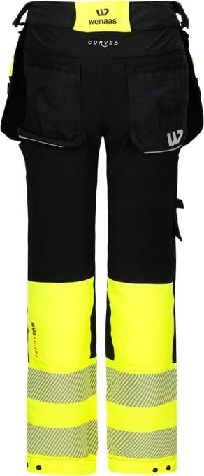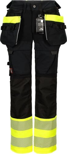 Komfortabel synlighets arbeidsbukse med 4-veis stretch og segmenterte reflekser gir god bevegelsesfrihet. Formsydd etter den kvinnelige fasongen. Integrerte ventileringsfelt gjør at buksen oppleves luftig. Forlenget linning bak og avtakbare hengelommer. Mange praktiske lommer og kneputelommer med to høydenivåer. Mulighet for å legge ned 5 cm på benlengde og viddejustering gjør at buksen passer de fleste.