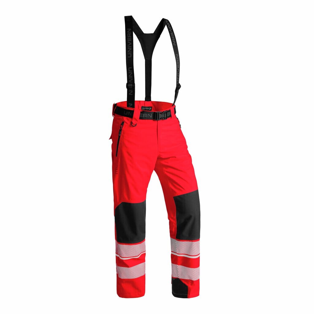 Helt vind- og vanntette skallbukser Dope-dye-innfarget tekstil og med meget høy pusteevne. Fôr i gjenvunnet polyester. Høy bevegelseskomfort med bl.a. forbøyde bukseknær og med ekstra høy linning i rygg. Avtakbart elastisk belte og seler. Glidelåser i bukseben opp til knærne. Regulerbar fotvidde med velcro og snølås. Innvendige knebeskytterlommer. Tommestokklomme. Velcrofester for hammerholder. Forsterkningsmateriale på knær og benavslutning. To baklommer med klaff og to forlommer med vanntette glidelåser. Segmenterte reflekser og Signal Lucence-teip for økt synlighet og sikkerhet. Vannsøyle: 30.000mm. Pusteevne: 25.000g/m²/24h. Miljømerking: Oeko-tex, Dope-dyed Certifikat: EN 20471 kl.2, 25 vask. EN 343 4,4,X.