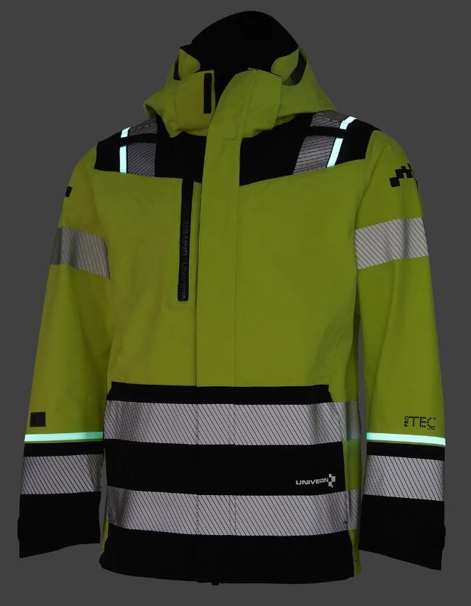 Skalljakke fra Univern i 3-lags stretch. Segmenterte reflekser og Signal Lucence teip for økt synlighet og sikkerhet.