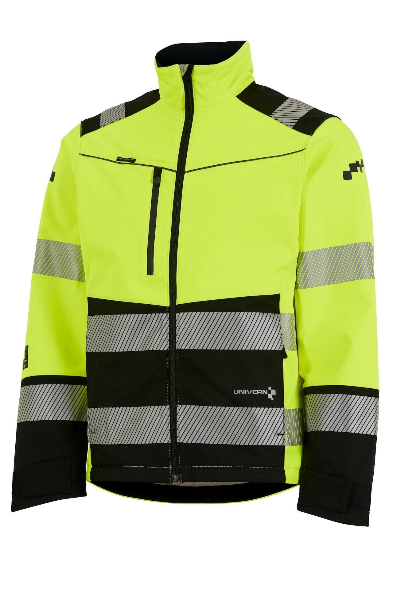 Fleksibel og slitesterk 3-lags softshelljakke med resirkulert polyester som er vind- og vannavstøtende. Fleecefôret innside. Sidelommer med glidelås. Brystlomme med ID-kortholder med glidelås på utsiden. To innerlommer. Justerbar nede med elastisk snøring. Borrelåsjustering i armer. Segmenterte reflekser. Pusteevne 10.000gr/m2/24t. EN ISO 20471 Kl.3 ( S Kl.2 ).