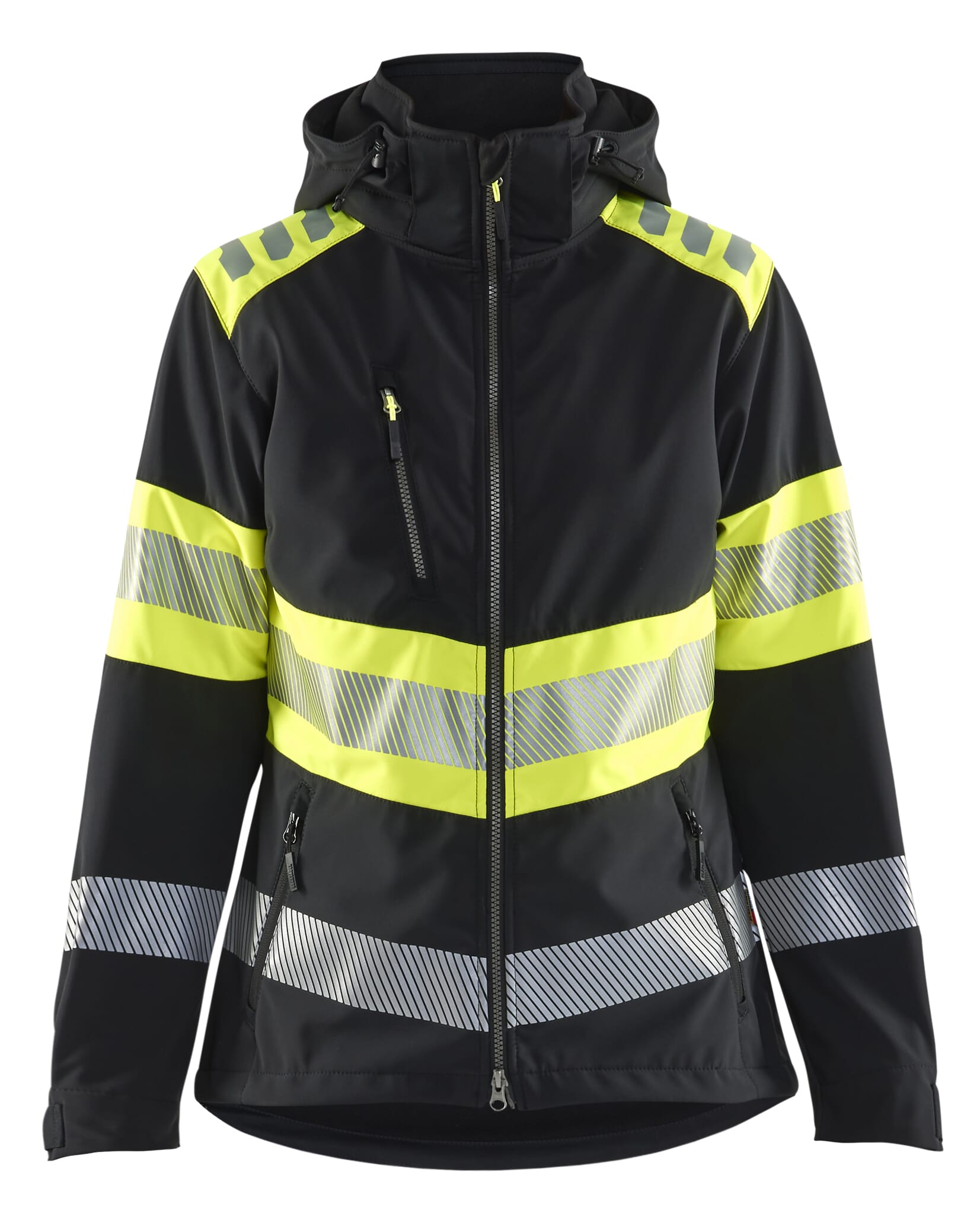 Lett softshelljakke med damepassform, som takket være materialet er ekstremt myk, behagelig og smidig. Denne varseljakken med brystlomme og toveis glidelås i fronten har både den lette, tøyelige følelsen og styrken som et arbeidsplagg skal ha. I tillegg er stoffet vann- og vindtett og har svært gode pusteegenskaper. Jakken har avtakbar hette.