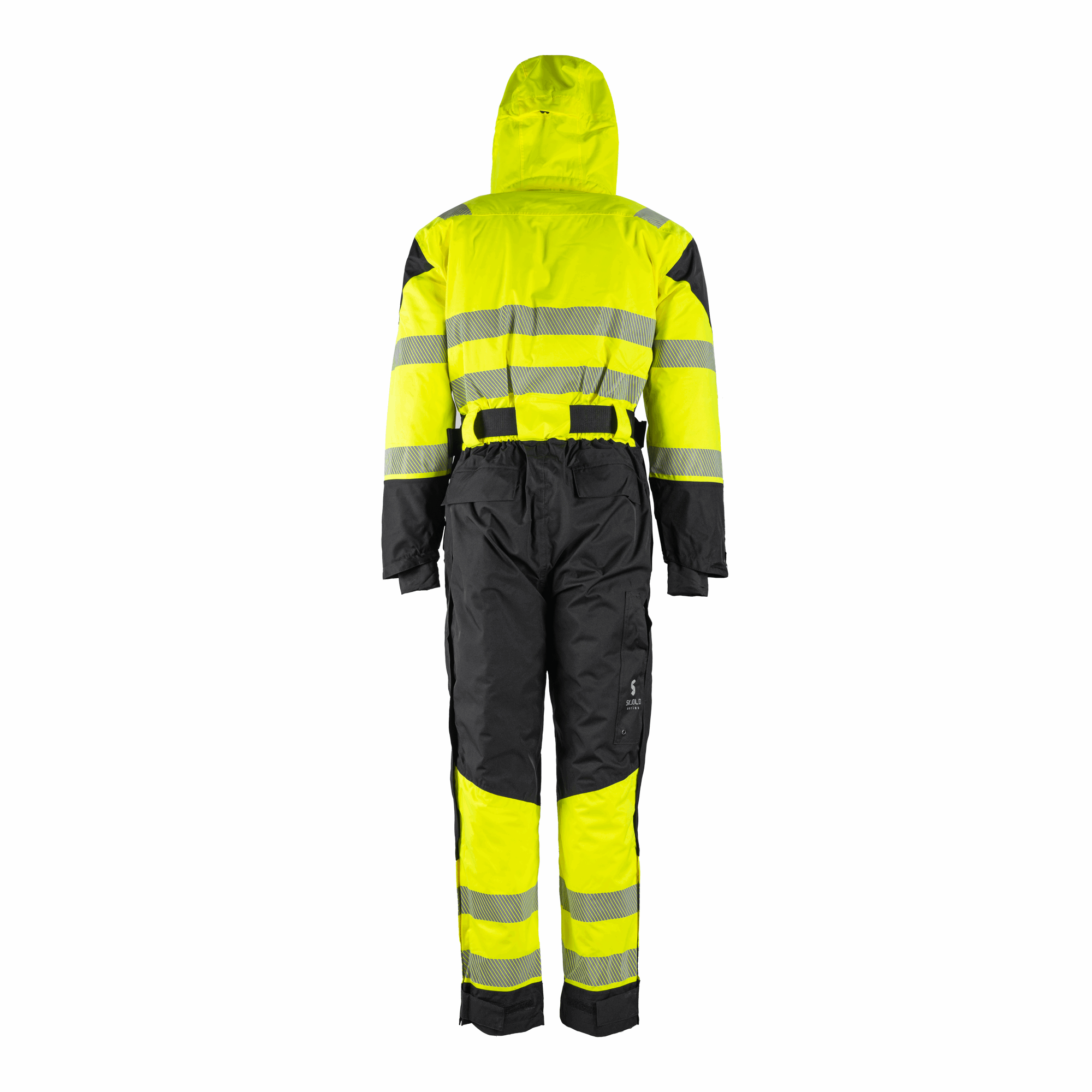 Vattert kjeledress med rip-stop ytterstoff i 150D polyester stretch/PU laminert. Polyestervattering med vekt; 120 gr/m2 i kropp, 100 gr/m2 i armer og ben. Alle sømmer er tapet for å unngå vanngjennomtrengning. Stor napoleonslomme på bryst. Stormlomme bak klaff med plass til nettbrett. Segmenterte reflekser. ID kort lomme. Glidelås i ben helt opp til livet. Innvendige seler (avtagbare). En innerlomme. Dreneringsfelt nederst i ben. Stikklommer med glidelås. Kneputelommer. Mykt fleecefor i krage. Toppkvalitet YKK glidelås i front. Nylonmansjett med tommelhull i erme. Borrelåsjustering v/erme. Avtakbar hette. Høy synlighet ISO20471 kl. 3. Vanntett etter EN343:2019 kl. 4,1, X