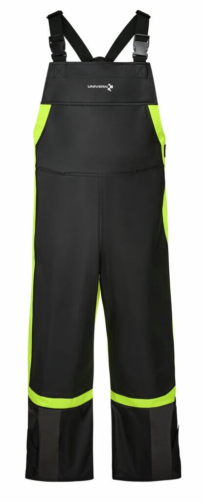 Slitesterk og smidig regnbukse i ftalatfri PVC med kontrastpartier. Sveiste sømmer som tåler høy slitasje. Dobbeltt stoff med dreneringshull på framsiden av lårene for økt levetid. Fast elastikk på sidene for en smidig og tilpasset passform. Brede og justerbare seler. Skjult lomme med vindu for f.eks. mobiltelefon på innsiden foran. Sveist forsterket brettekant. Svart refleks og kraftig fotviddesjustering med borrelås ved benavslutning. Laget av ftalatfri PVC som tåler flere kjemikalier, fiskefett og oljer. God isolasjonsevne mot kulde.