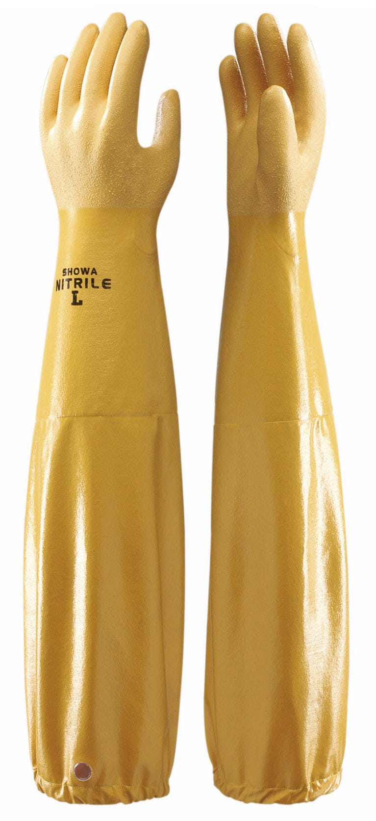 Ekstra lang hanske for vått og tørt arbeid. Nitrilbelagt. Slitesterk og oljebestandig. Påsveiset mansjett. Ru finish gir ekstra godt vått grep. Bomullsfôret. Strikk øverst. Hull øverst på mansjetten for oppheng. Tykkelse 0,8 mm. Lengde 65 cm.