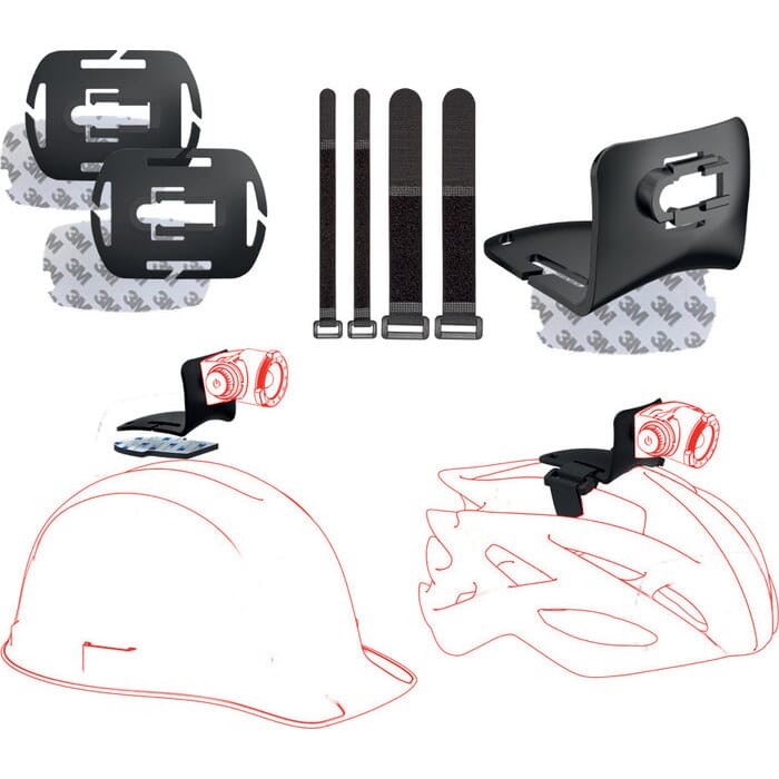 Hjelmfestekit til H-serien. Leveres med 4 borrelåsfester, 2 front og bakfeste med limpute og et feste for toppmontering av lykten på toppen av hjelmen med limpute.