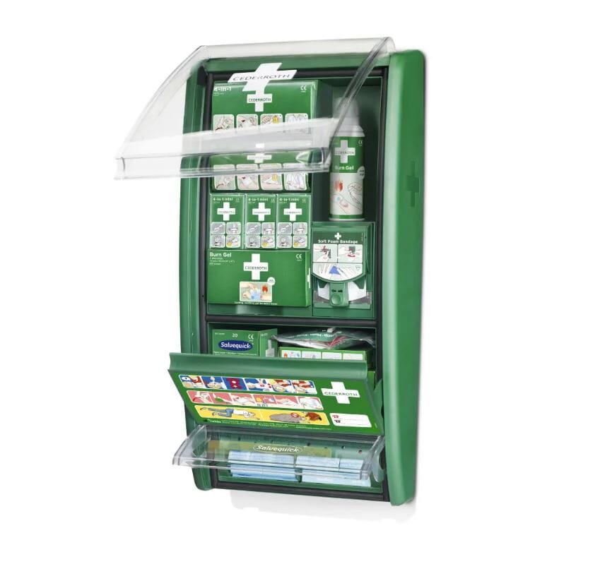 Førstehjelpsstasjon for arbeidsplasser med risiko for brannskader og/eller som håndterer matvarer, f.eks. storkjøkken, næringsmiddelindustrien samt verksteder. Cederroth Soft Foam Bandage Blue er et elastisk selvheftende plaster for maksimal bevegelighet. Cederroth Burn Cover beskytter og lindrer smerten ved mindre brannskader. Salvequick Blue Detectable plaster er egnet ved håndtering av matvarer. Mål: B 29 x H 56 x D 12 cm,