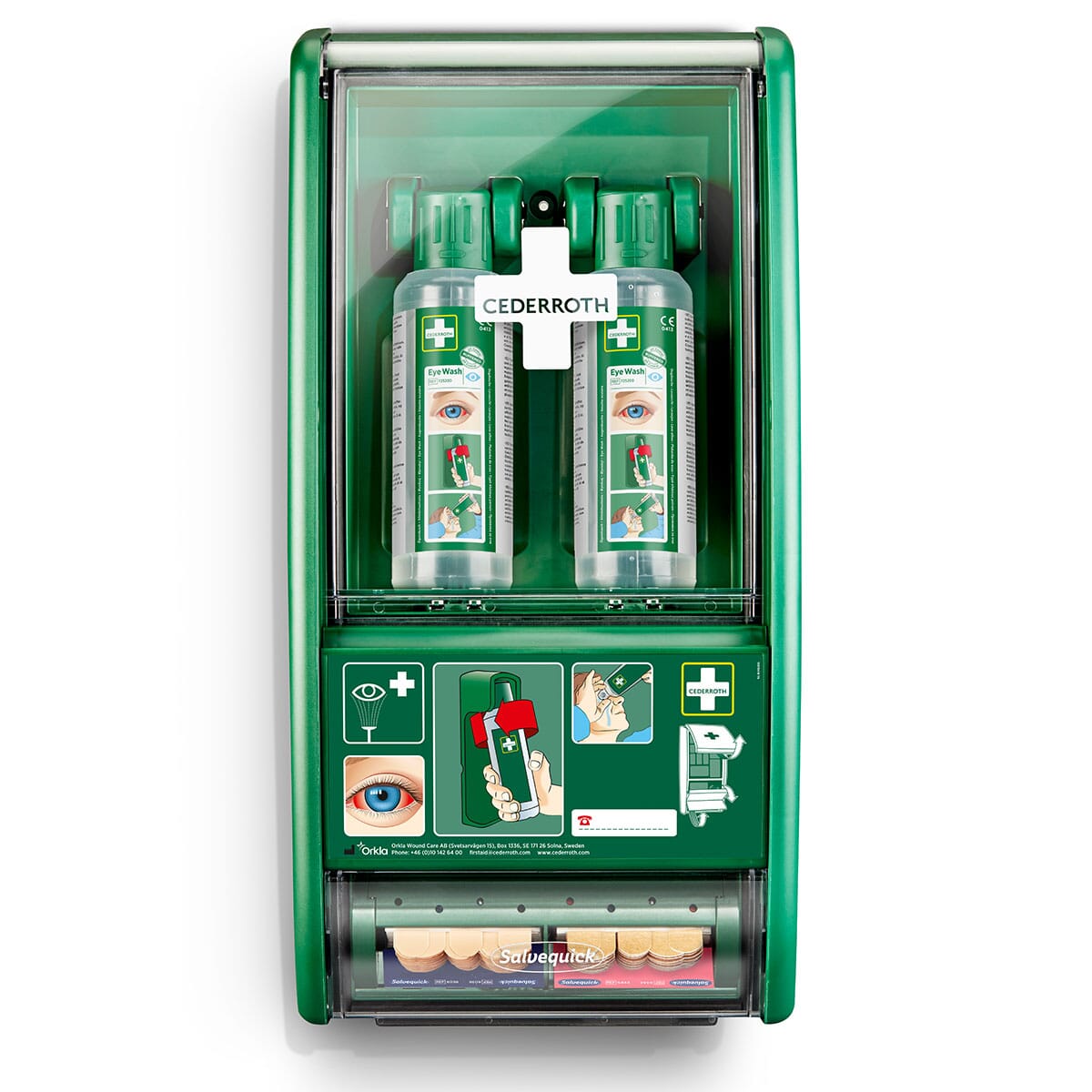 Stasjonen inneholder 2 flasker som åpnes automatisk når de vris ut av holderne. Flaskene er utformet slik at øyet får rikelig flyt av væske i ca. 1,5 minutter. 4,5 års holdbarhetstid. Bufret væske øker sjansen til å redde øynene. Cederroth Øyedusj virker ved at den nøytraliserer øyets pH-verdi, dvs. at den har en nøytraliserende effekt på sprut av alkalier og syrer, noe som gir raskere resultat