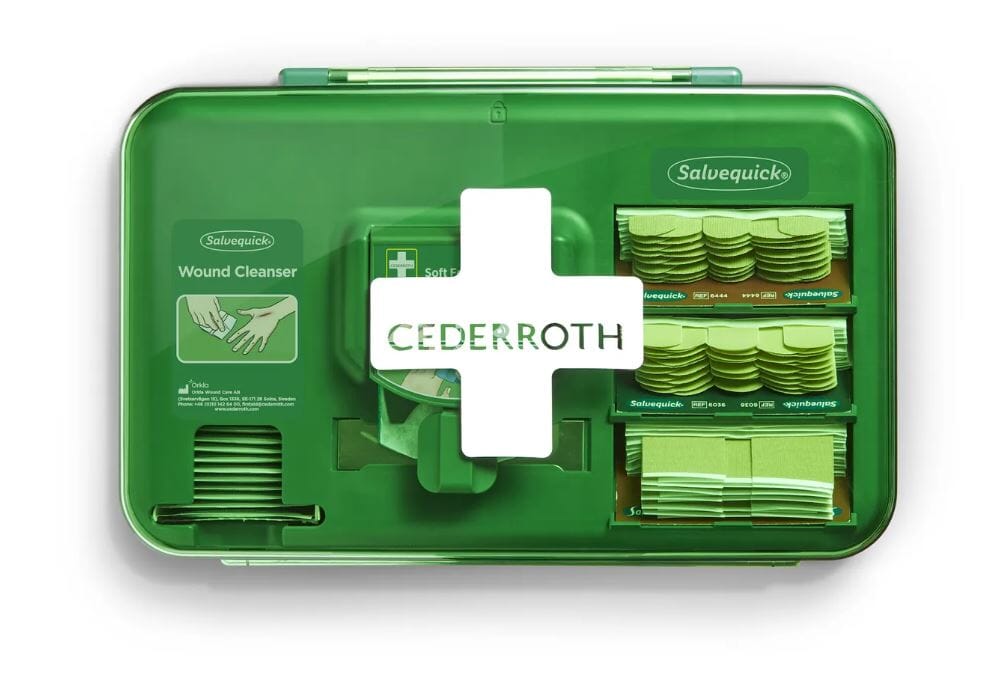 Innhold: Salvequick Sårvask 40 stk, Cederroth Soft Foam Plaster Blue 4,5m, Salvequick Tekstilplaster, 40 stk, Salvequick Plastplaster 45 stk, Salvequick XL Tekstilplaster 21 stk,1 refillnøkkel.