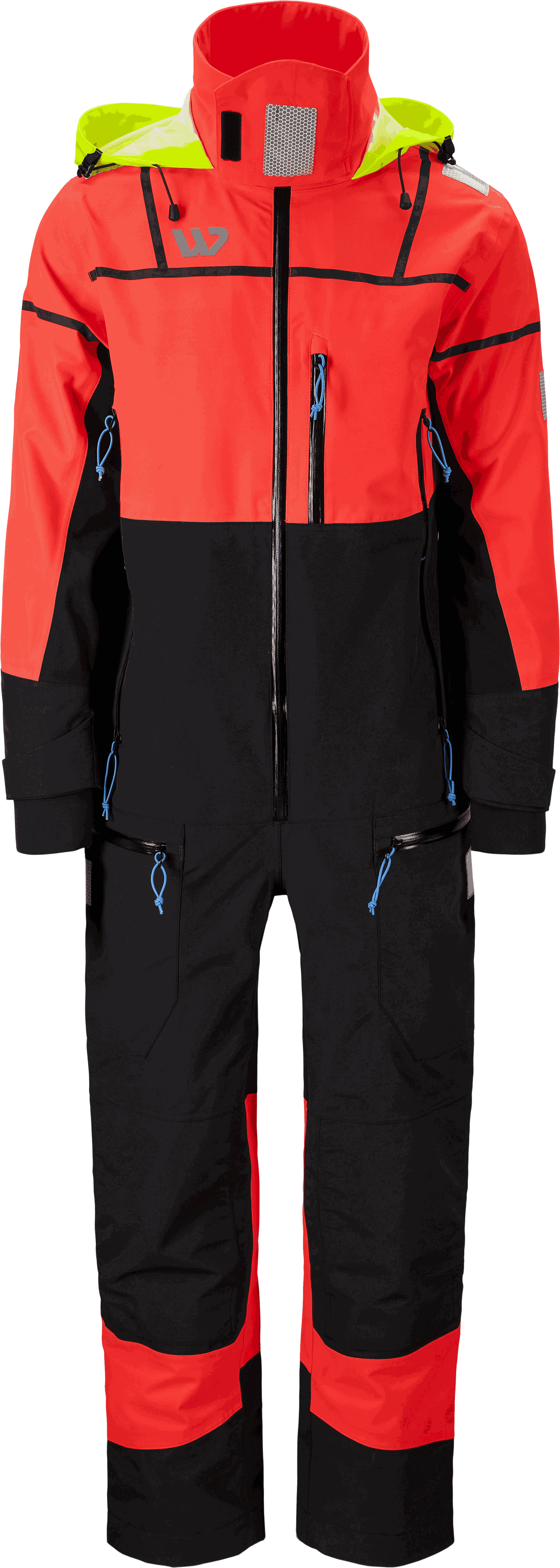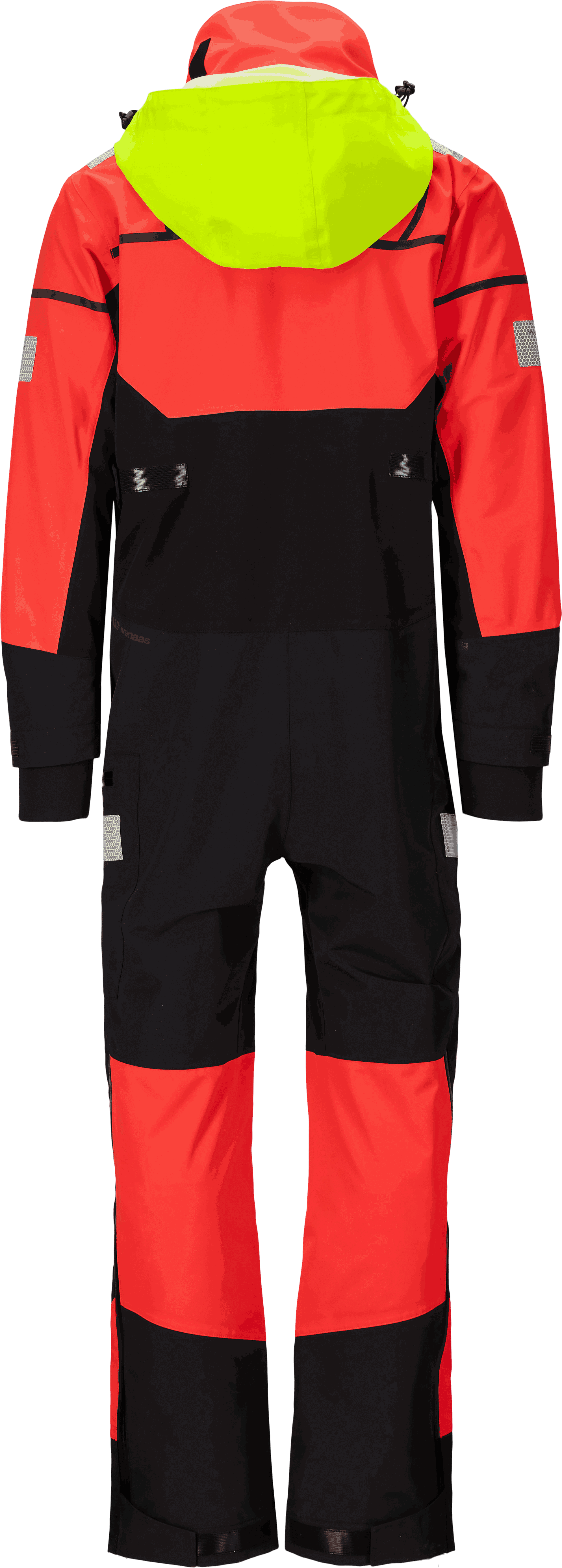3-lags kjeledress, hette med snorjustering, krage, glidelås foran, refleksbånd på hette, krage, skuldre, ermer og lårlommer, svart varmeoverføringsrefleks på bryst, rygg, skuldre og ermer, brystlomme venstre side, lårlommer foran, store front-/sidelommer, glidelås i sidesøm for ventilasjon, justering i midje bak, ermer og ben, knelommer, glidelås nederst i ben, alle glidelåser er vanntette.